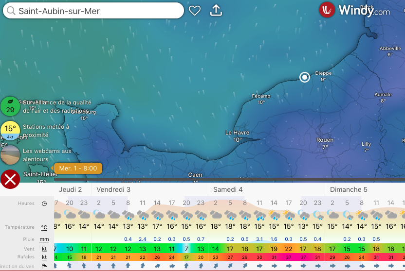 L’ouverture de vent dite sécuritaire sur le spot de Saint Aubin sur Mer, Haute-Normandie, France est de Ouest jusque Nord-Est , et la mise à l’eau ne pourra s’effectuer minimum que deux heures après la marée haute !